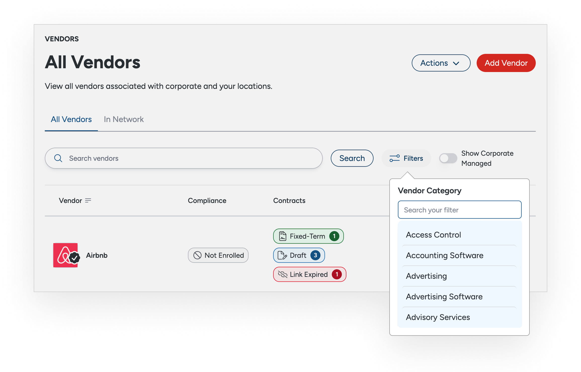You can also filter all vendors by category, helping you analyze vendor distribution across the portfolio and by property.
