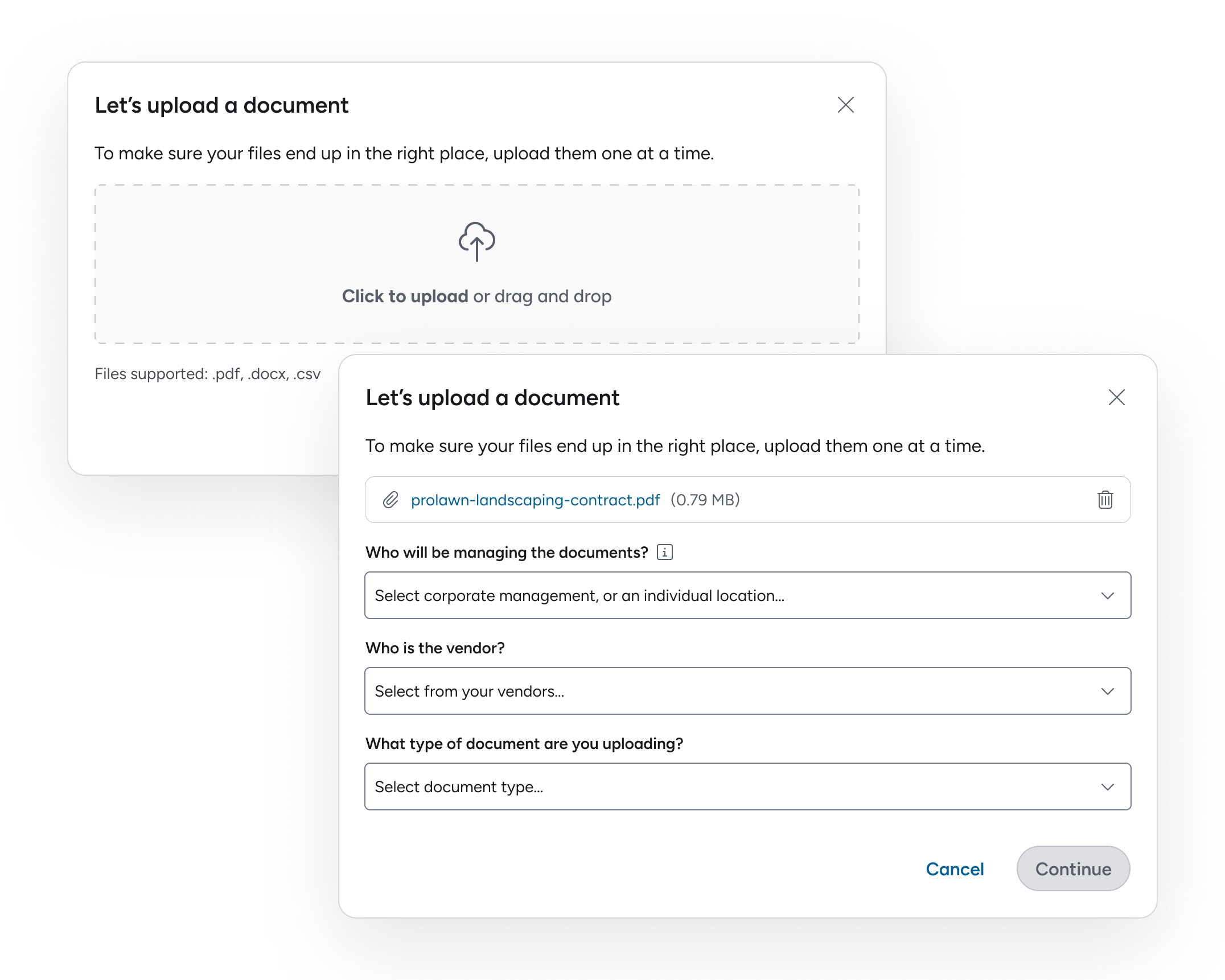 So we've redesigned the document upload experience to capture key contract details at the time of upload. You'll specify who's managing the document, which vendor it's for, and what type of document it is.