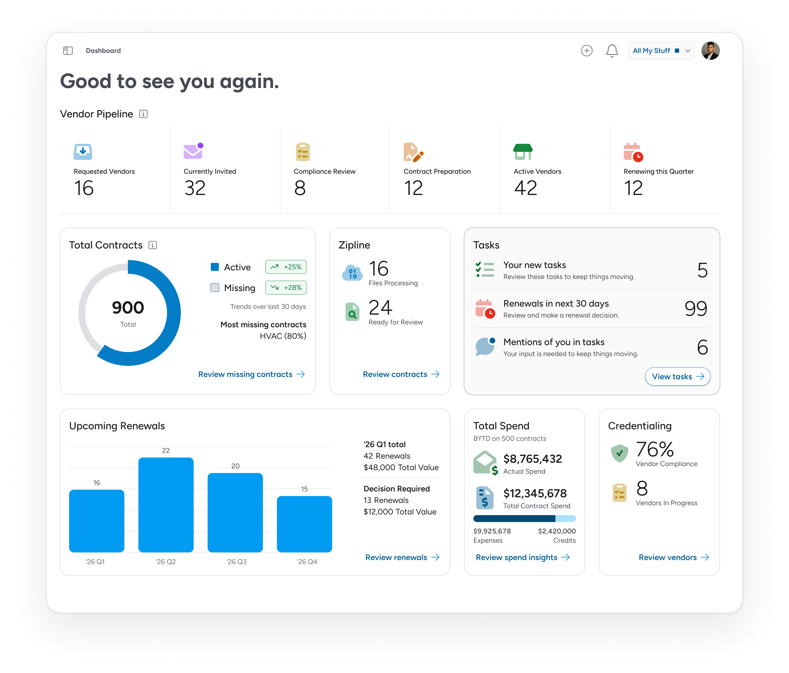 View your contracts at a glance. See how many contracts you have, how many are coming up for renewal, and where you're missing documentation.